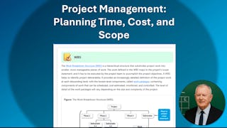 Skills you'll gain: Project Schedules, Work Breakdown Structure, Cost Estimation, Cost Management, Project Scoping, Scheduling, Budgeting, Project Planning, Timelines, Resource Management, Resource Allocation, Project Management, Time Management, Agile Project Management, Microsoft Excel, Microsoft Word, Microsoft Office, Team Leadership, Leadership, Leadership Development