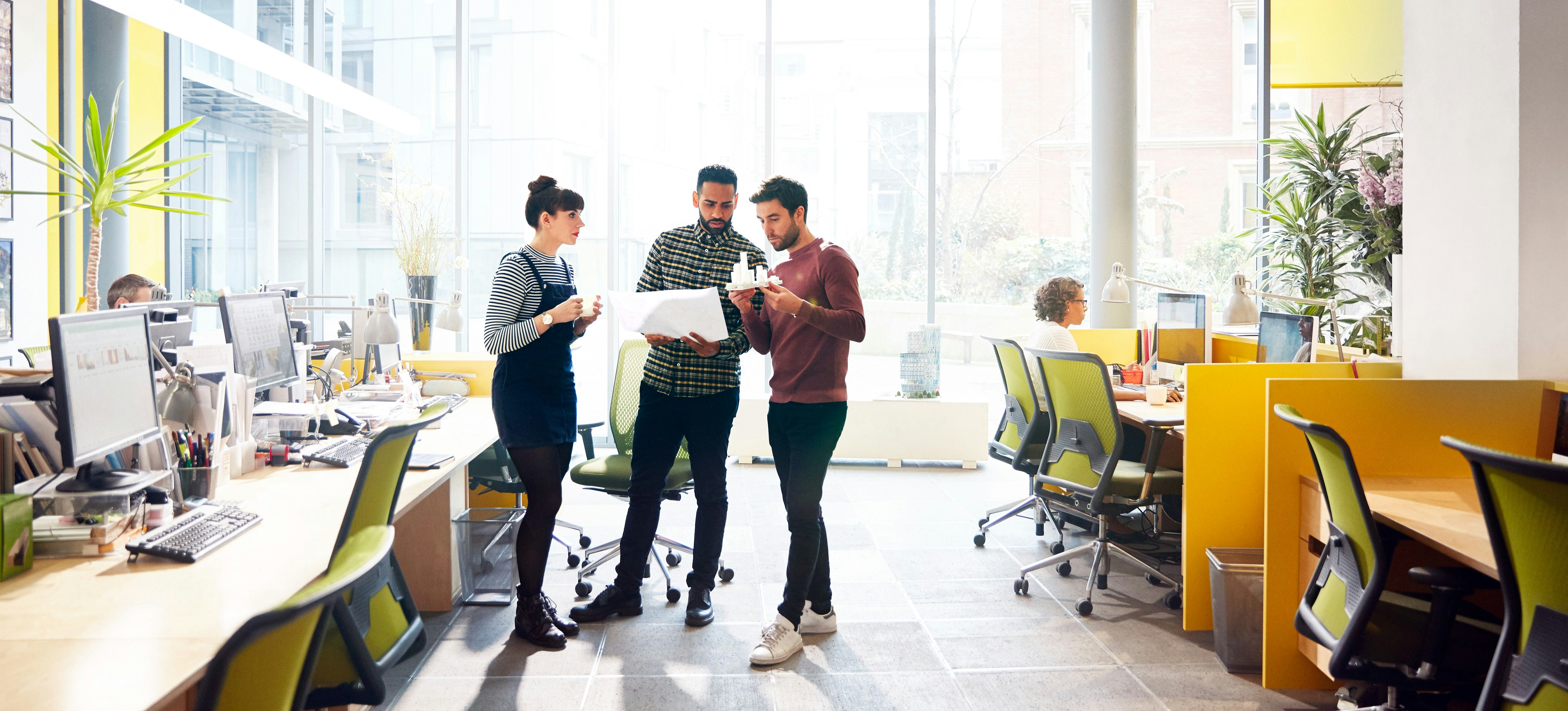 [Image en vedette] Les collègues de travail collaborent à un plan de gestion de projet.
