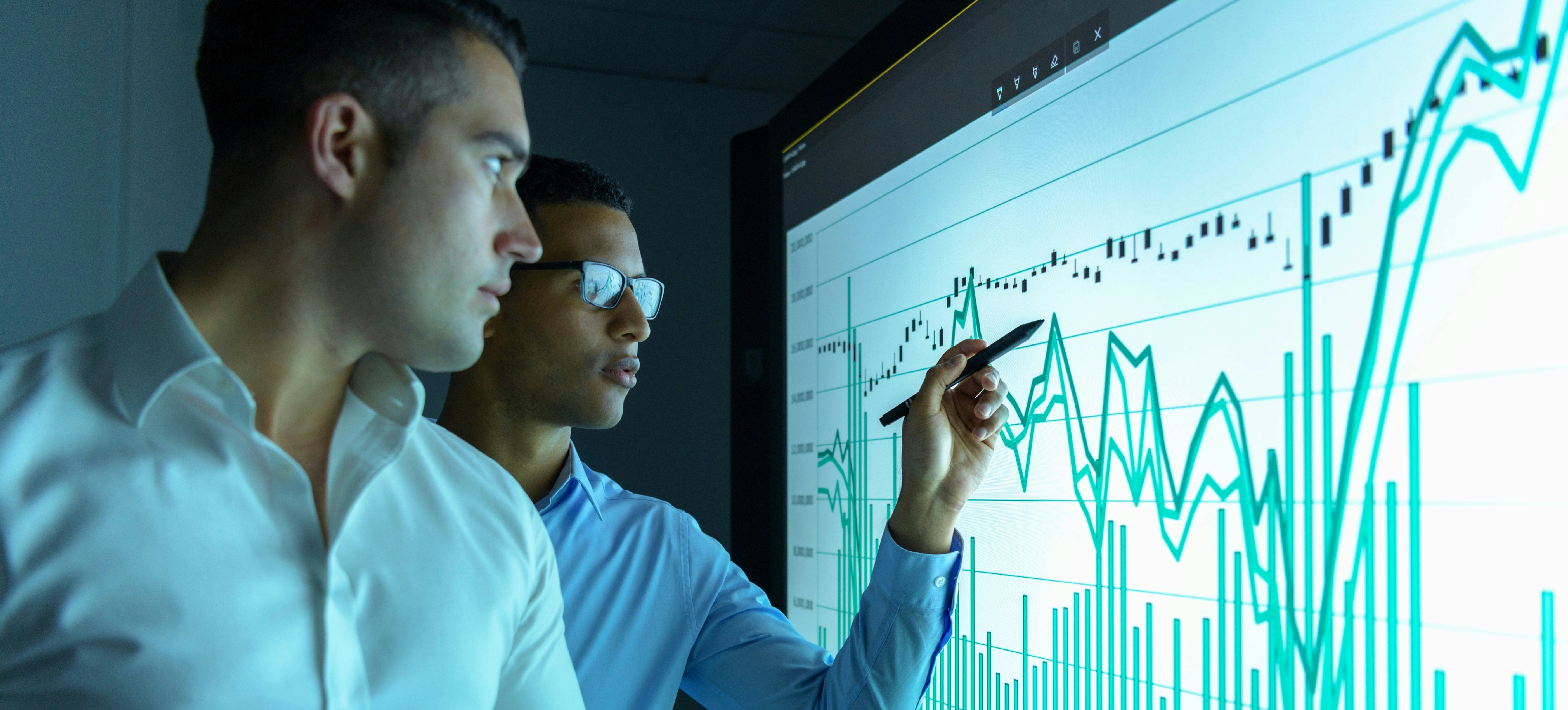 [Featured Image]: Two business intelligence professionals review company data and look for trends to inform decisions.