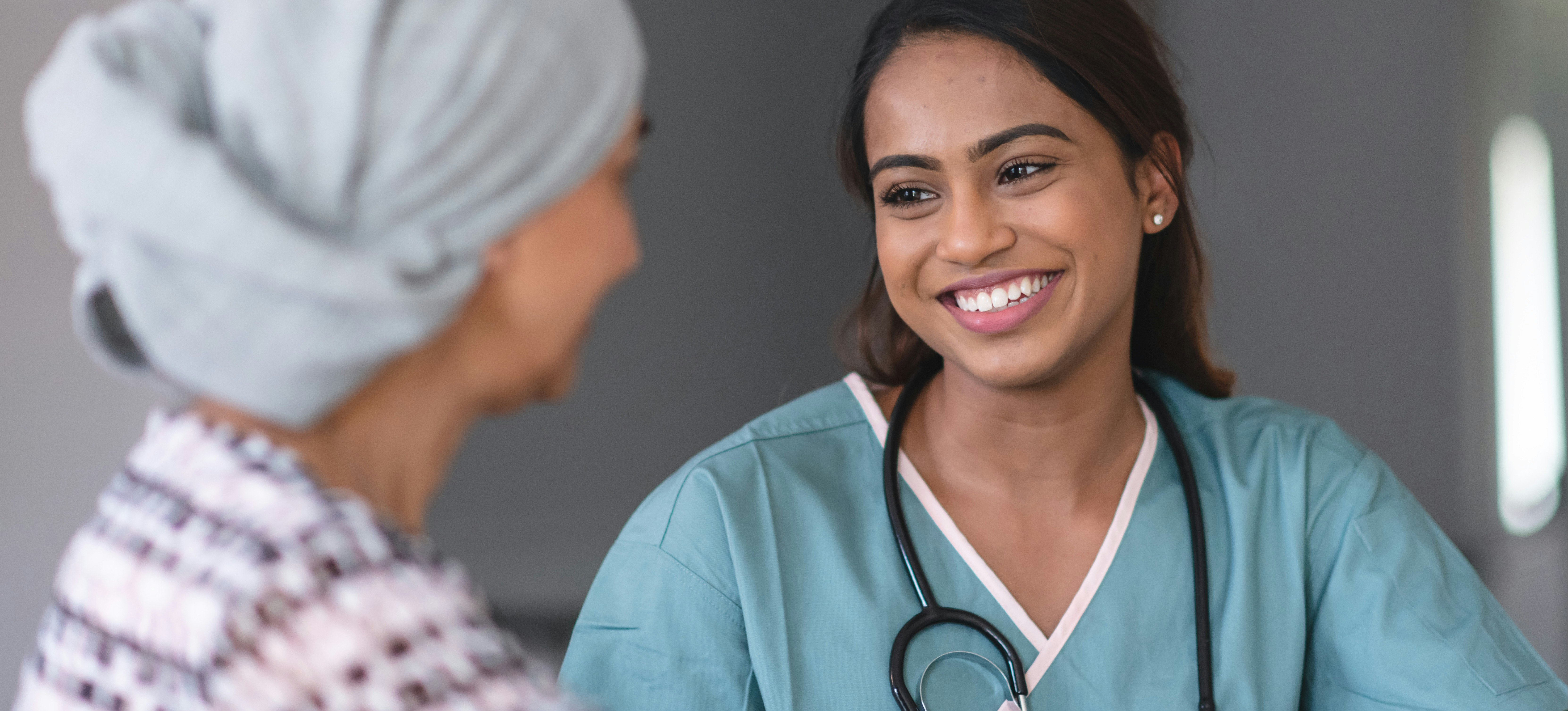 [Featured Image] An oncology nurse wearing light blue scrubs and a stethoscope around her neck speaks with her patient, who is wearing a black and white sweater and a head covering.