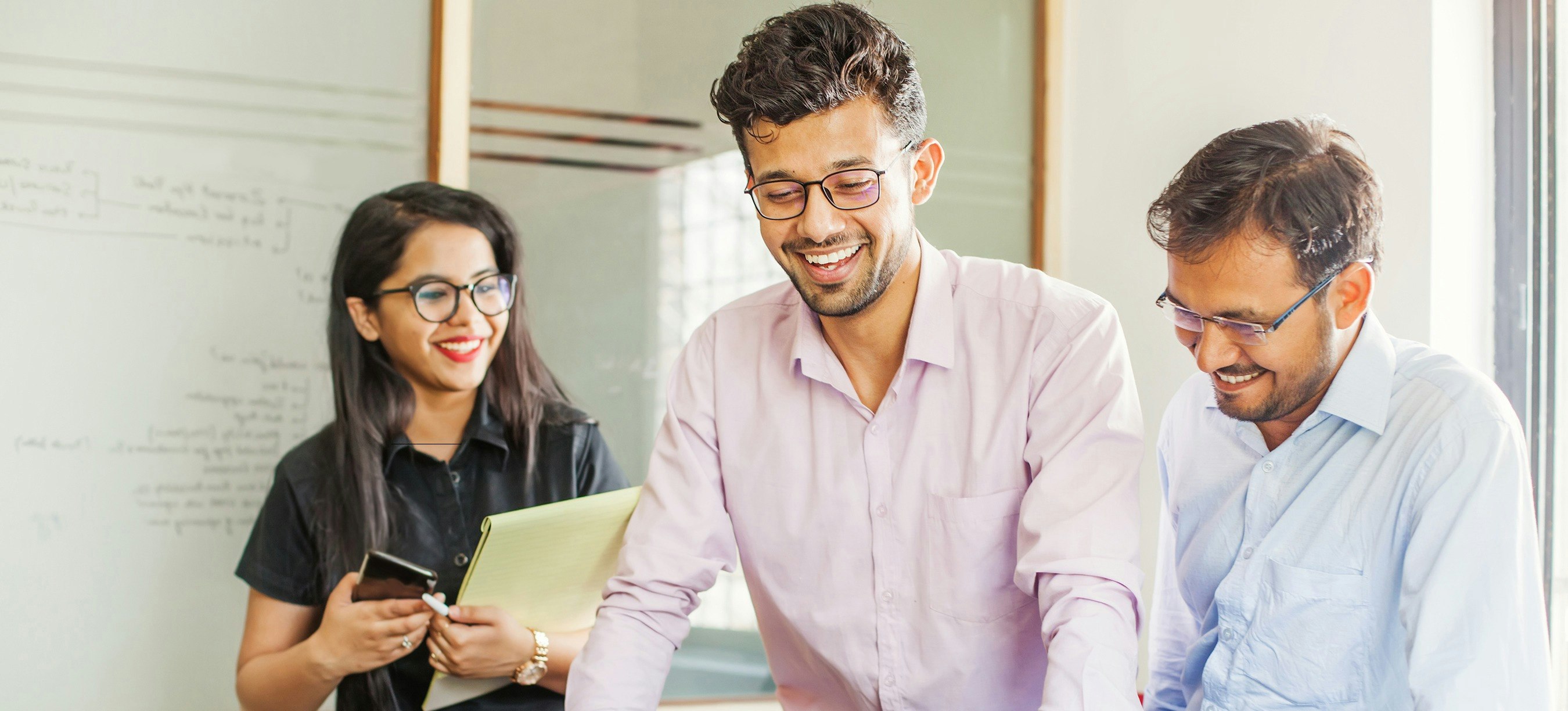 [Featured Image] Three IT professionals at their job looking at a laptop.