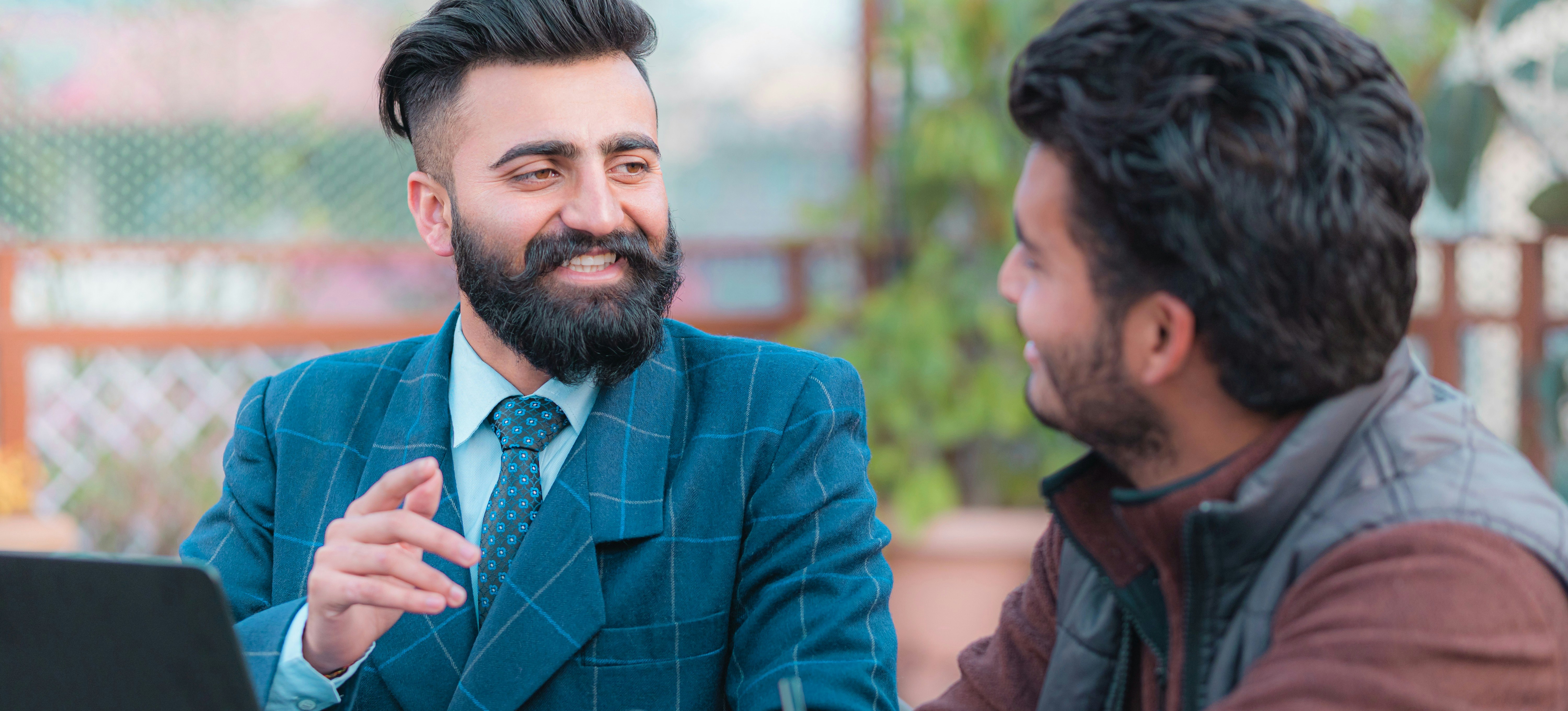 [Featured Image] A management consultant dressed in a blue suit and tie discusses business with a client while they are sitting in an outdoor venue in front of a laptop.