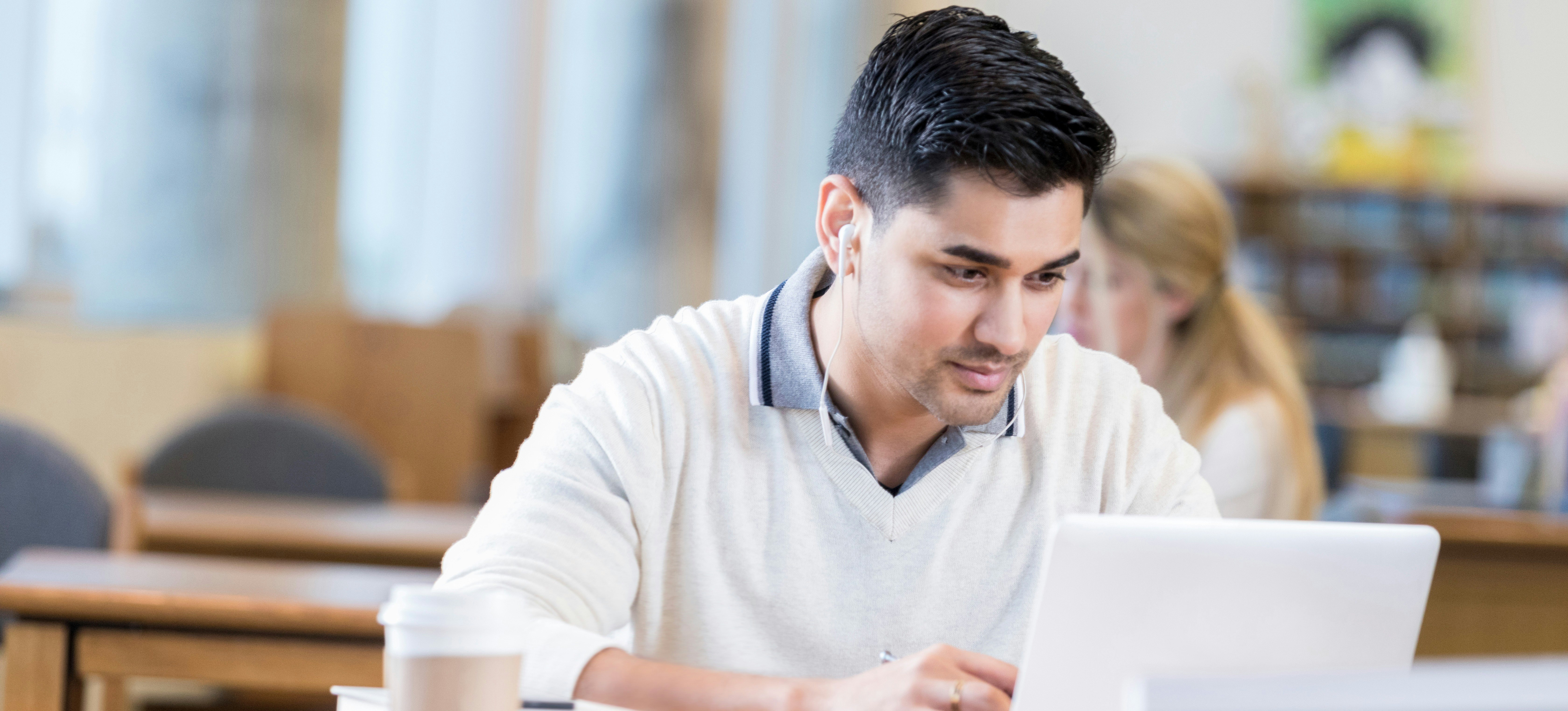 [Featured Image] A young  learner uses a laptop in a library to research what the difference is between BE and BTech.